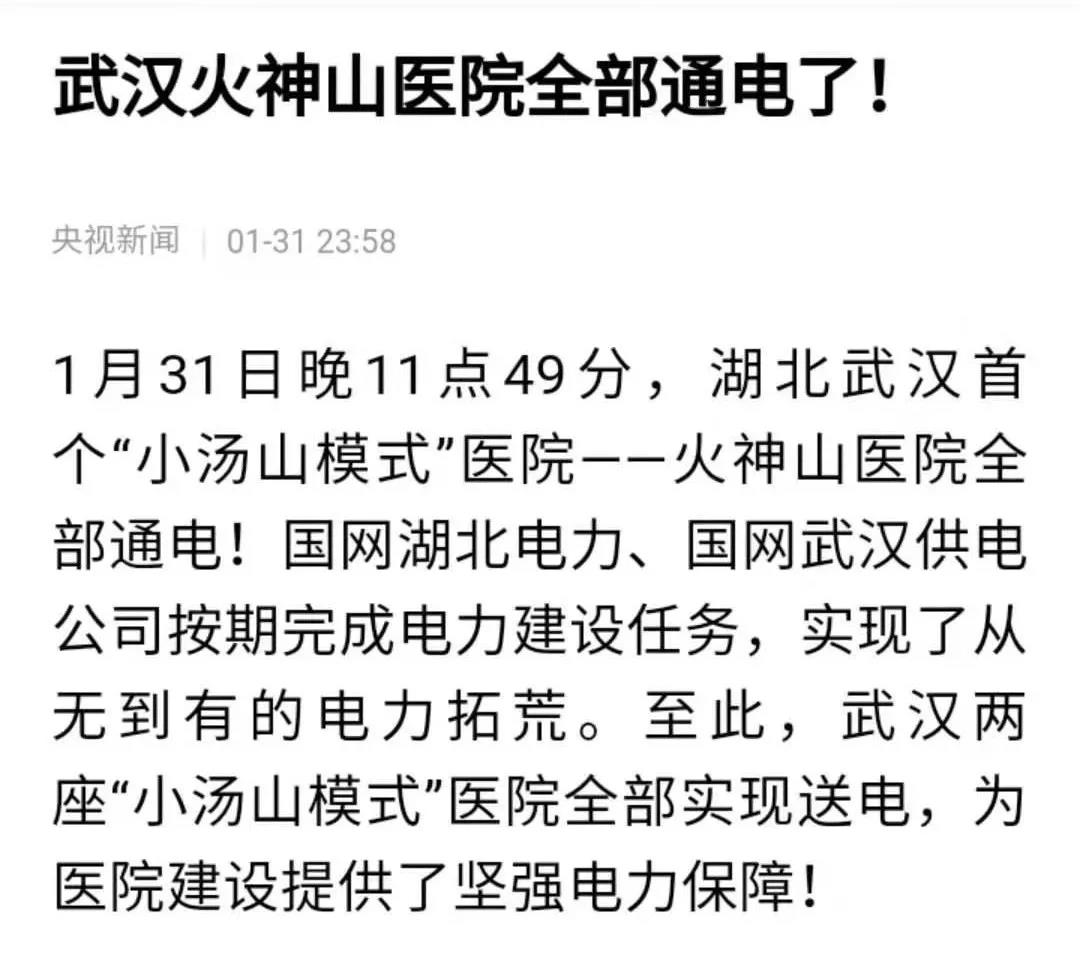 世人拾柴,1月31日晚11点49分,湖北武汉首个“小汤山模式”病院火神山病院全数通电。