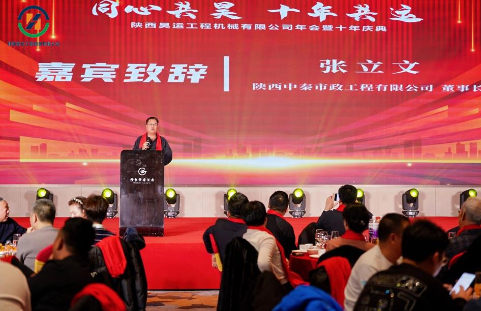 陕西昊运工程机械无限公司2026年年会暨十周年庆典2月8日正在陕西省西咸新区举行,中国人平易近解放军原南京学院文忠平易近将军到会恭喜并讲话,公司董事长宁等先后做公司成长环境引见,优良合做伙伴代表、陕西中秦市政工程无限公司董事长张立文致辞,公司全体员工、客户代表等共约200余人加入勾当。